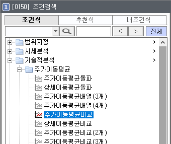 0150 화면을 열면 "기술적분석" > "주가이동평균" > "주가이동평균비교"를 선택합니다.