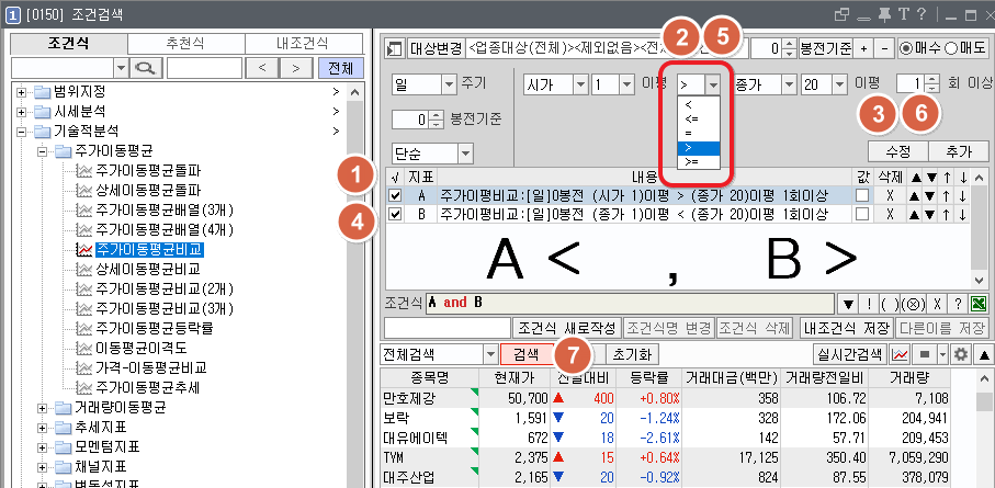 비교 대상이 되는 이평선의 값을 변경하면 종가가 5일선을 데드크로스(골드크로스)하는 종목을 찾을 수도 있고