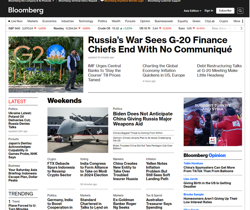 블룸버그는 경제학, 금융 등에 대한 최신 뉴스, 시장 데이터 및 차트, 금융분석, 기업분석, 정치 뉴스 등을 다루고 있으며