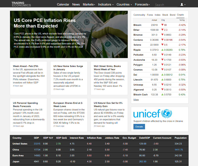경제 지표, 주요 국가의 통화 가치 등의 정보를 제공합니다. (https://tradingeconomics.com/)