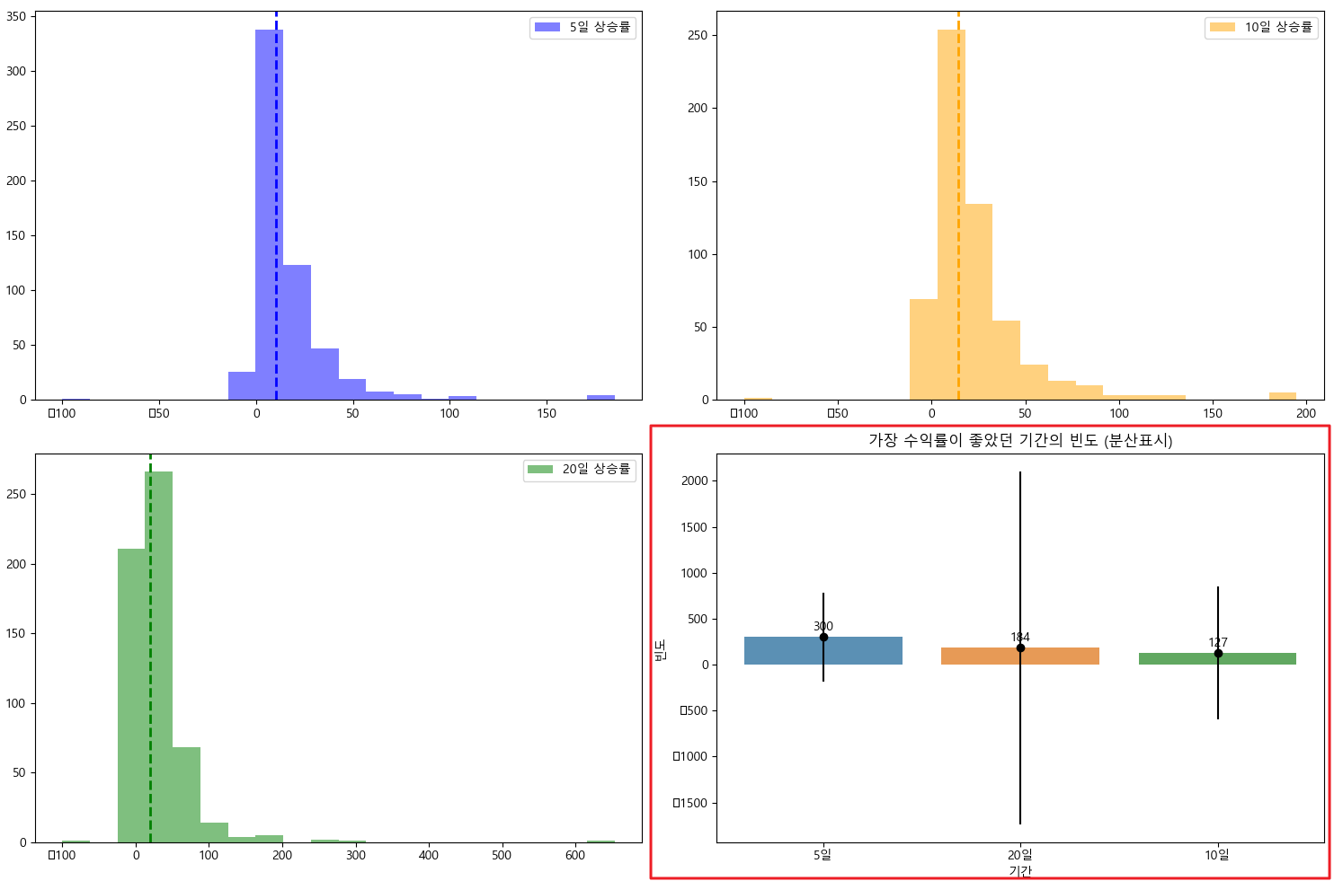 빈도 바 차트 위에 수익률 분산을 나타내는 오차 막대(각 기간의 분산크기를 나타냅니다.)를 추가해서 빈도와 분산을 동시에 파악할 수 있도록 했습니다.