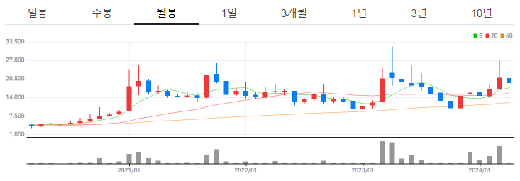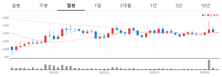 기술적 지표 분석에 따르면, 모멘텀 지표는 대체로 중립적인 신호를 보이고 있으며, MACD 지표는 매수 신호를, CCI 및 stochRSI 지표는 매도 신호를 나타내고 있어, 주가의 단기적인 움직임에 대한 다양한 분석이 가능해이므로 다각적인 접근이 필요해 보입니다. 월봉상으로는 아직 하락 추세를 이탈하지 못한 상태입니다.