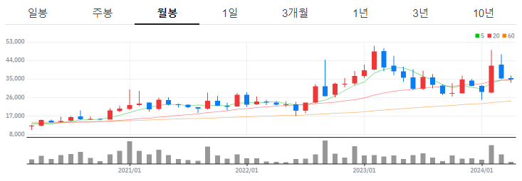 2020년부터 2024년까지 매출액과 당기순이익 모두 증가 추세에 있으며, 영업이익 또한 지속적으로 상승하고 있습니다. 특히 2022년에는 매출액이 29,346억 원, 영업이익이 3,998억 원으로 전년 대비 성장했으며 2024년도에는 최고 매출 & 영업이익을 달성할 것으로 파악됩니다.