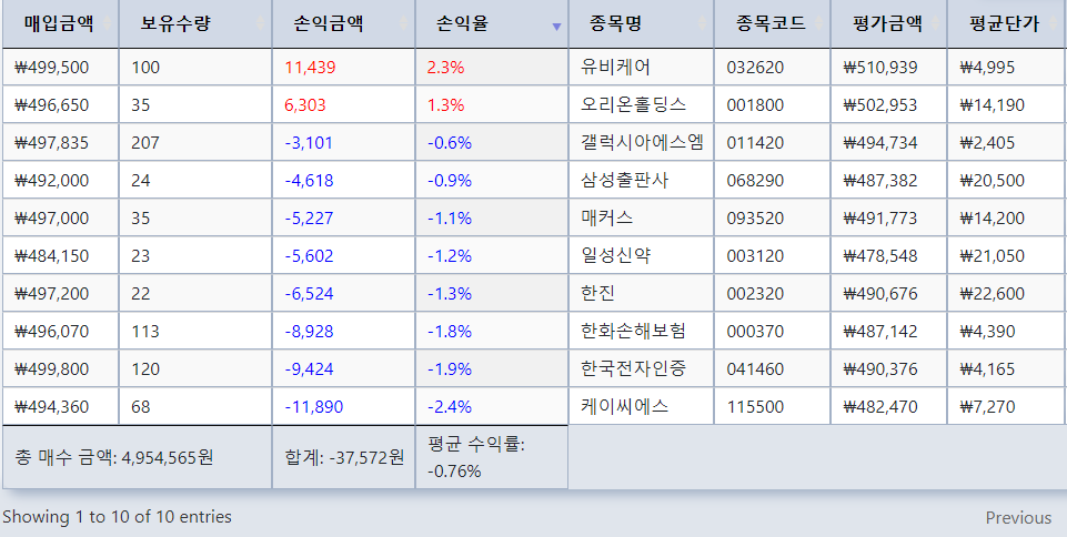 금일은 유비케어, 삼성출판사, 매커스 3 종목이 매수되어 현재 10 종목을 보유 중에 있습니다.