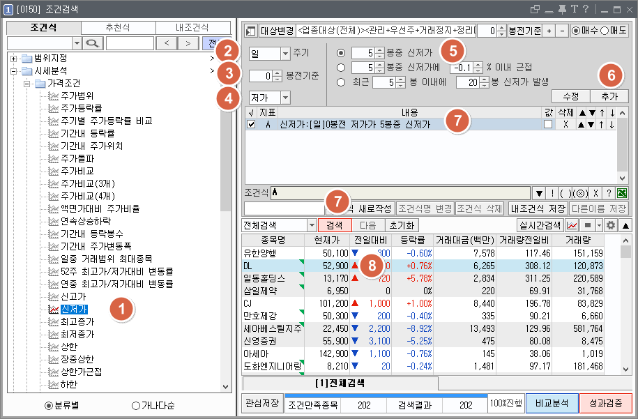 조건검색식을 통해 52주 신저가를 찾을 수 있게 되었지만