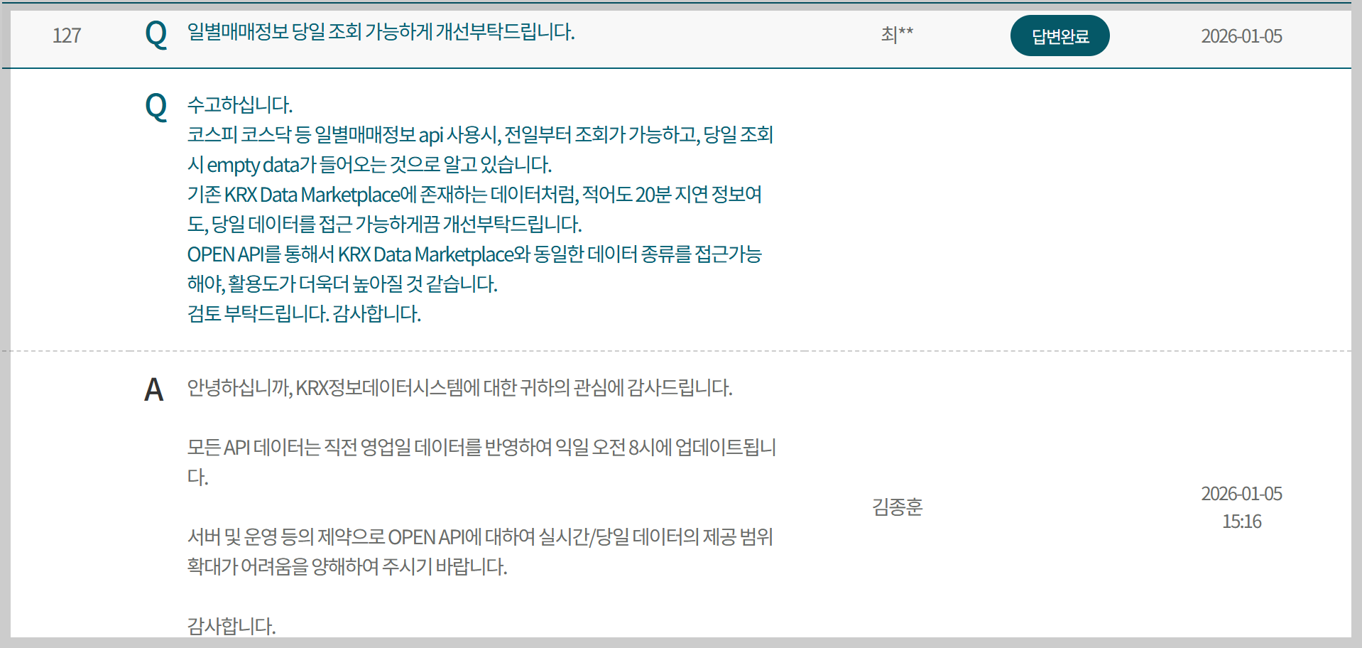 KRX OPEN API는 구조상: