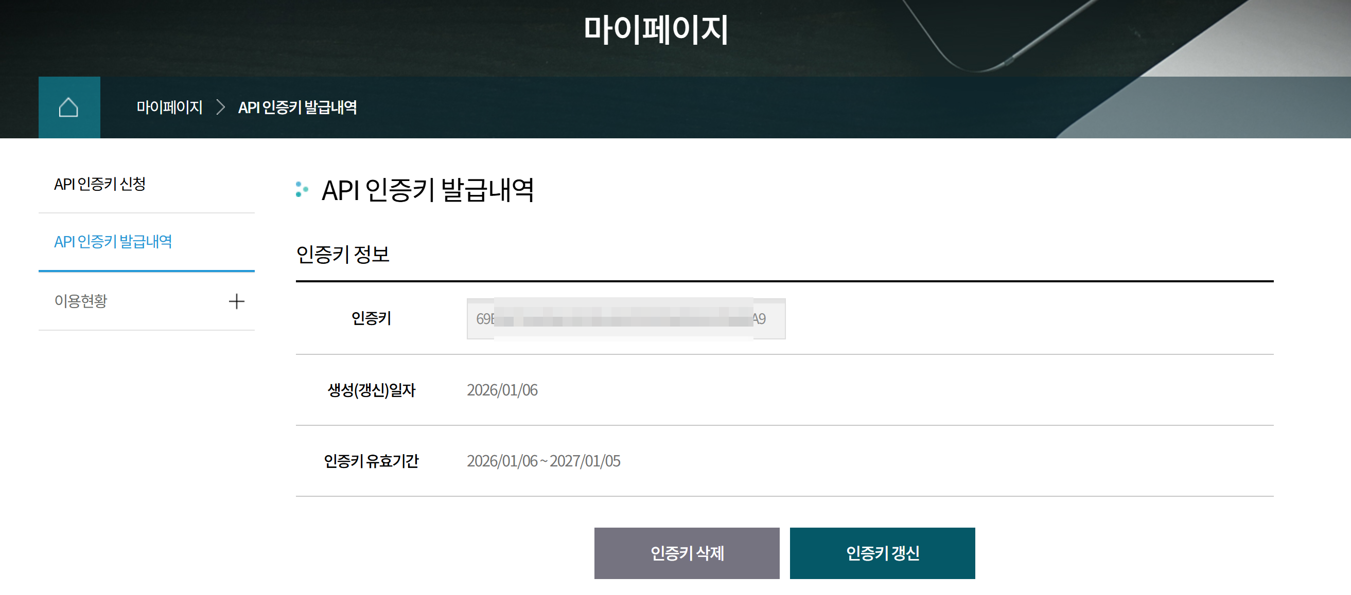 - 마이페이지에서 “API 인증키 발급내역”에 키가 생성됩니다.
