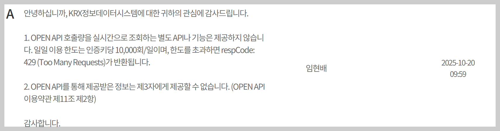 그리고 추가로 인증키당 10,000회로 되어 있는 것으로 보아 차후에 장중 데이터도 제공할 수 있을 것 같다는 생각을 해 봅니다. (25년도 내용)