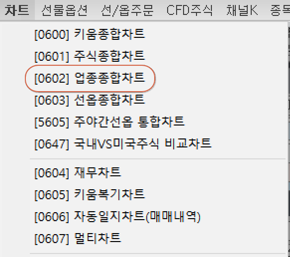또는 아래와 같이 영웅문 > 차트 메뉴 > [0602] 업종종합차트를 선택하셔도 위와 같은 업종종합차트가 열립니다.