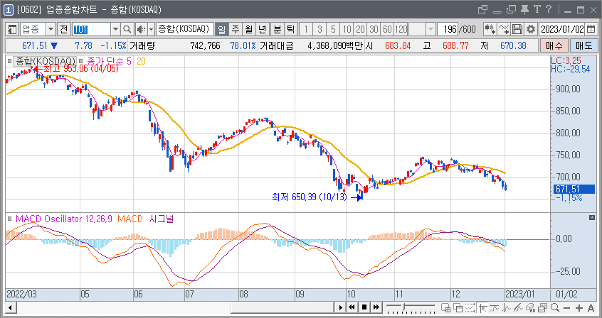 아래와 같이 MACD 차트가 적용된 화면을 볼 수 있습니다.