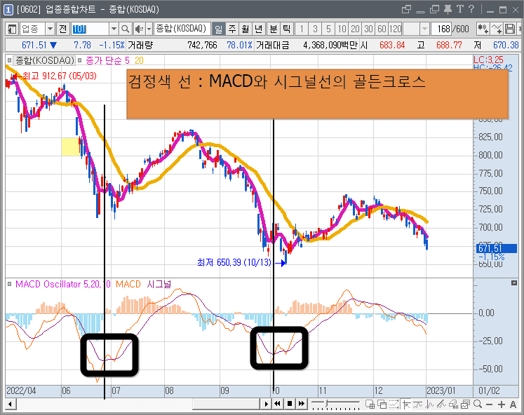 아래의 이미지의 첫 번째 검은색 박스와 선을 보면 골든크로스는 시그널선 위에 MACD선이 위치를 해야 하는 것인데