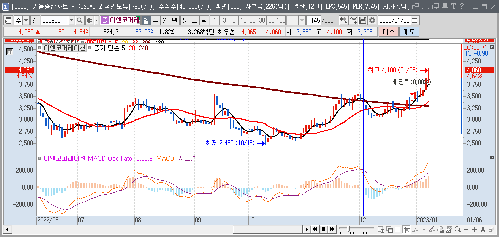 이 엔 코퍼레이션은 MACD(5, 20, 9)가 잘 맞았었습니다.
