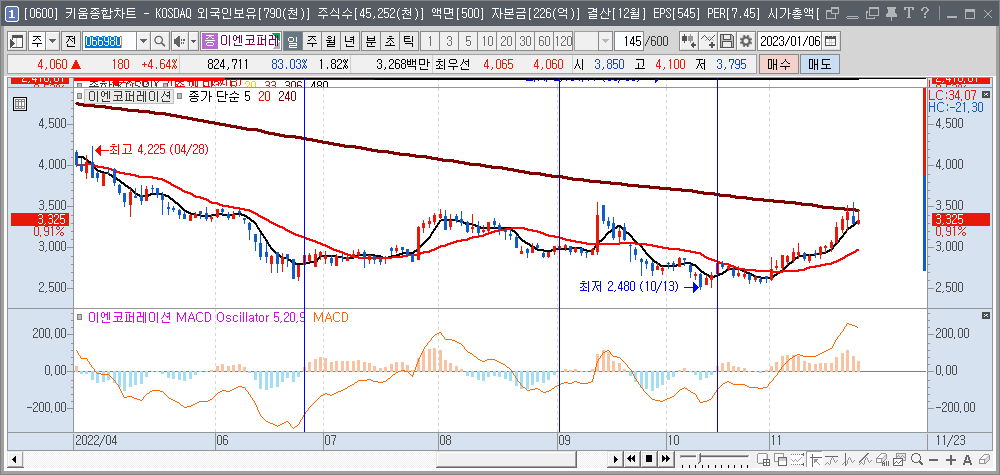 이 엔 코퍼레이션은 MACD(5, 20, 9)가 잘 맞았었습니다.