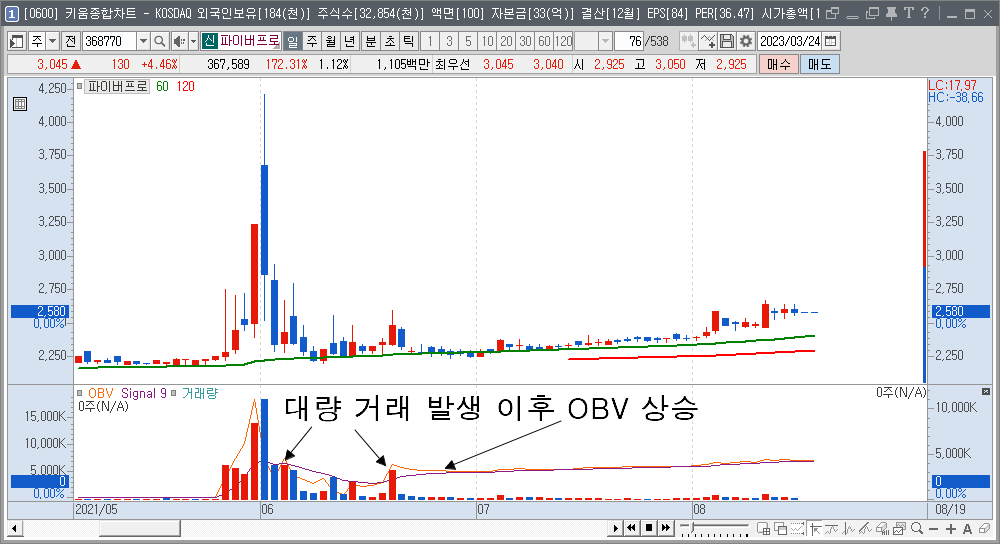 이처럼 발생된 거래량으로만 파악을 하더라도 OBV와 비슷한 수준의 상승흐름을 예측할 수 있을 것이라 생각합니다.
