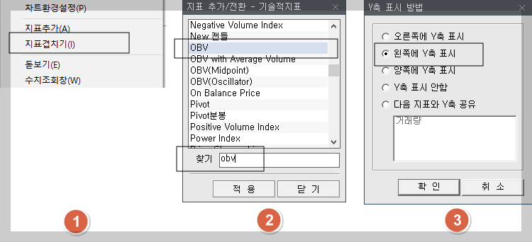 혹시라도 주가 차트 위에 OBV를 추가하셨으면 OBV 지표명을 선택하신 뒤에 키보드의 Del 키를 누르면 지표가 삭제됩니다. 그 뒤에 거래량 차트 위에서 위의 내용을 다시 시도해 보시면 잘 될 겁니다.