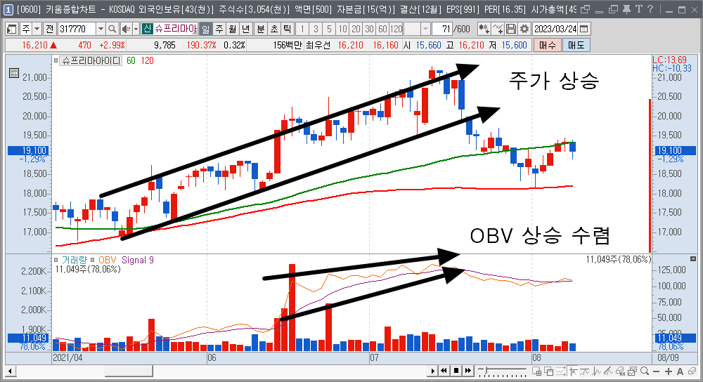 4-1. 주가는 상승, OBV는 상승수렴 형태 예시