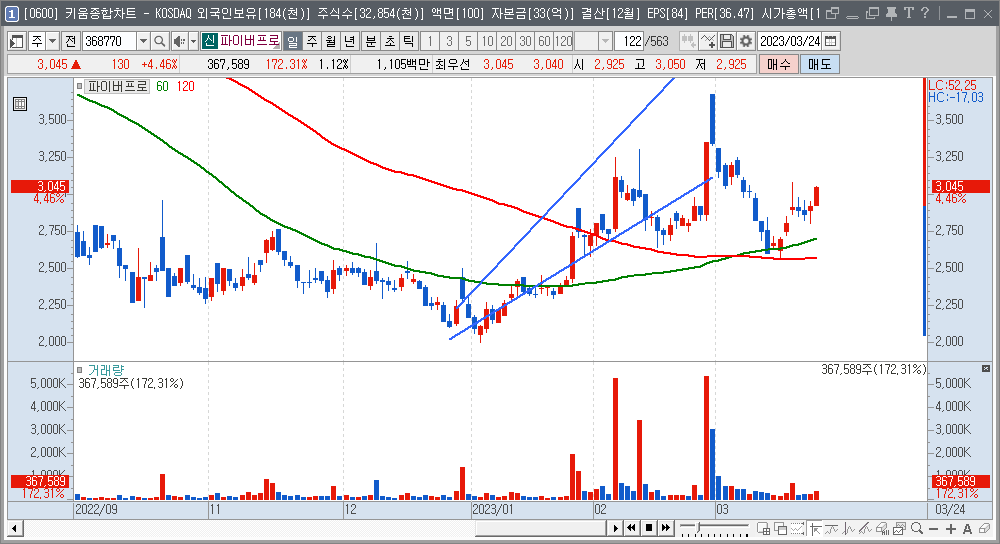 우선 파이버프로 종목을 선택하고 기본차트 구성으로 주가 차트와 거래량만 보이도록 설정을 해 두었습니다.