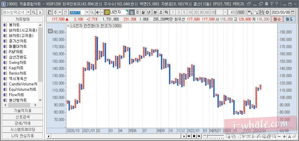 한국 증시에 적용되는 차트 유형은 캔들차트와 P&F 차트 모두 사용됩니다.