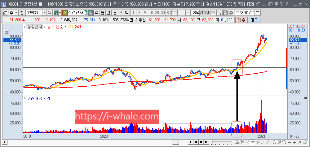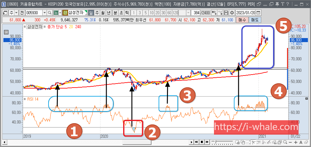 정확히는 삼성전자 정배열 구간에 대해서 RSI가 제대로 작동하는지 체크해 보도록 하겠습니다.