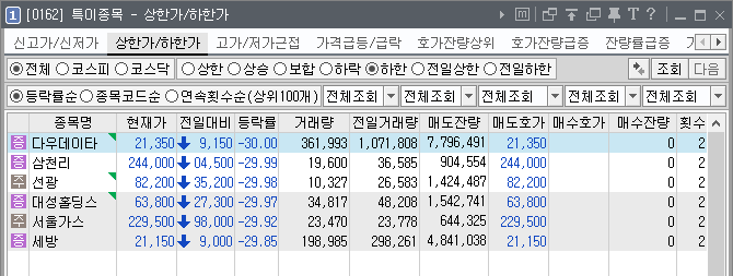 목차 2023년 4월 23일 하한가 종목, [0162] 화면 [0252] 증권사별 매매상위 확인하기 유통 주식 수 확인하기, [0919] 기업 분석 화면 투자자들이 사전에 체크해야 할 점 CFD 롤오버 실패로 인한 하한가 발