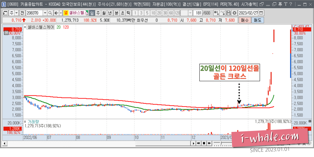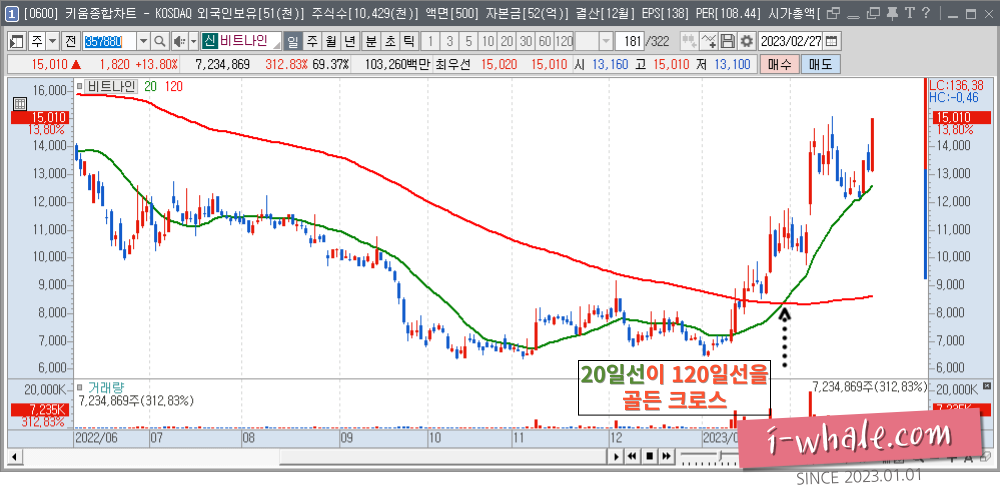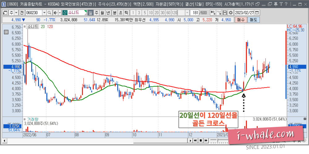 차트상의 흐름을 보면 단기 이평선인 20일선이 중기 이평선인 120일선 위에 존재하다가