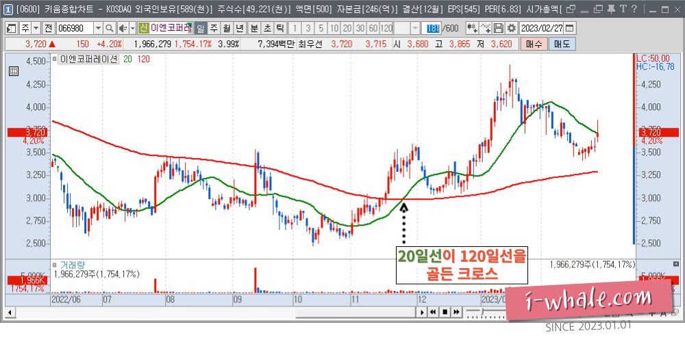 이 부분을 주식 시장에서는 골든크로스를 했다고 하며 세부적으로는 20일선이 120일선을 골든크로스했다고 말을 합니다.