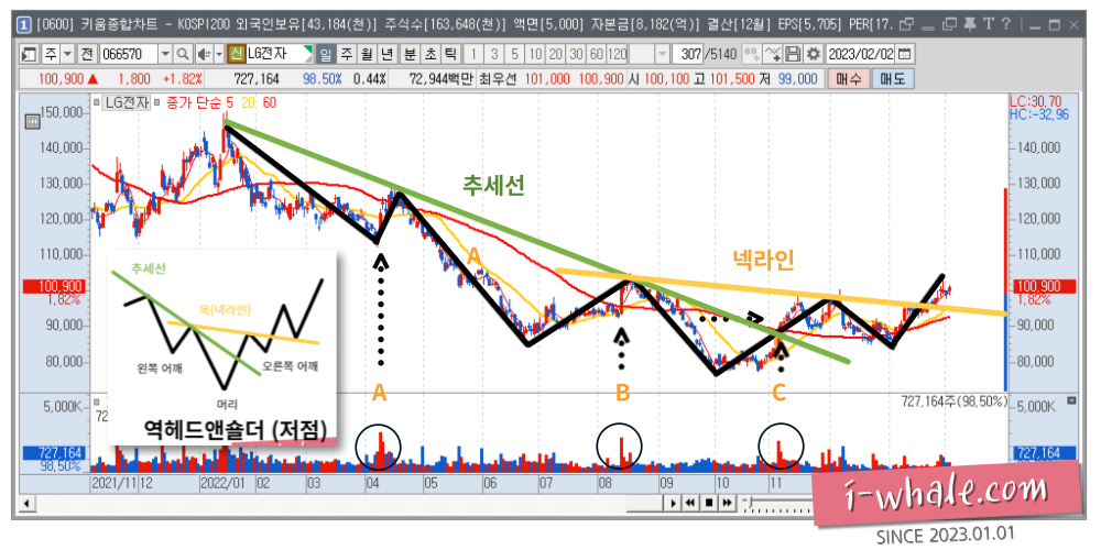 역헤드앤숄더 차트로 진행 중인 LG전자 차트를 보면서 분석하겠습니다.