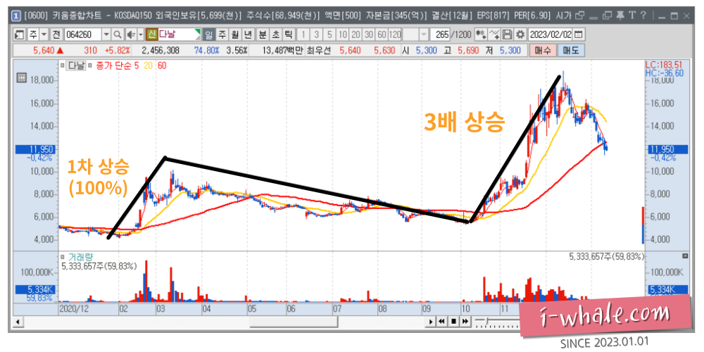 또 다른 케이스로는 50% 100% 이상의 주가 상승을 이끌며 1차 시세를 주면서 장기 이평과의 이격을 벌린 후 다시금 조정 흐름으로 전환되며 개인의 물량을 털어버린 뒤에 급등을 하는 경우 등이 존재합니다.