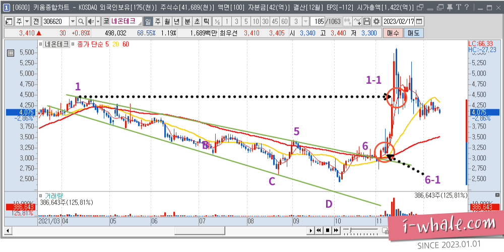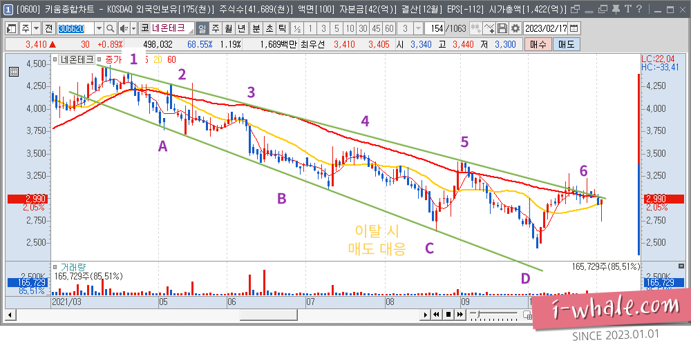 안녕하세요. 지식 공유를 즐기는 인천고래입니다. 지난 글에서 하락 확대 쐐기형 패턴에 대해서 알아보았습니다. 어제 예시로 네온테크 차트에 하락 확대 쐐기형 패턴을 적용해서 설명을 드리