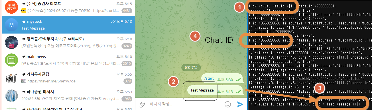 9자리 이상의 숫자로 이루어진 값을 확인할 수 있습니다. 해당 ID가 Chat ID입니다.