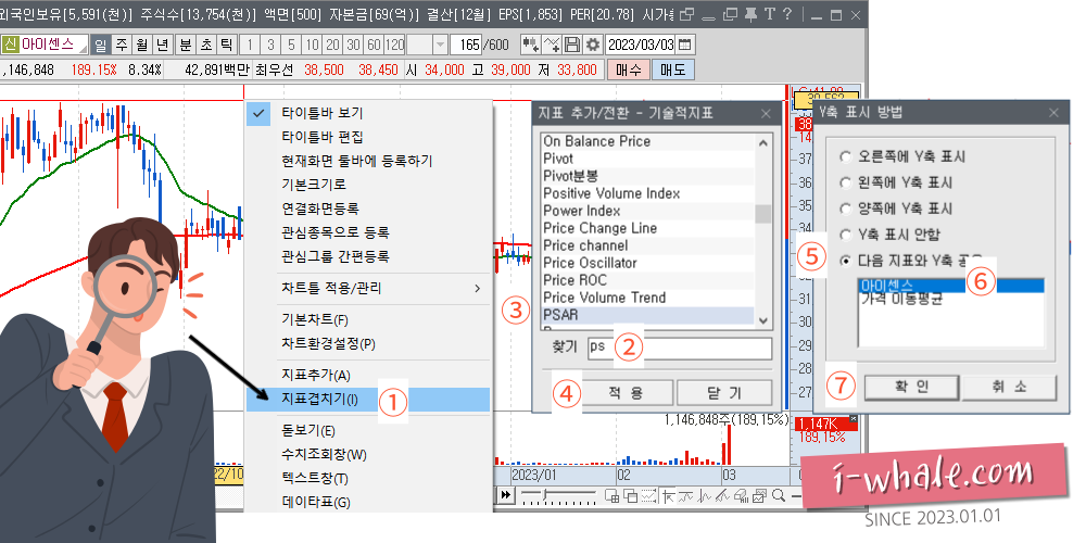 1-1. 차트에서 마우스의 우측버튼을 클릭하여 "지표겹치기"를 선택합니다.