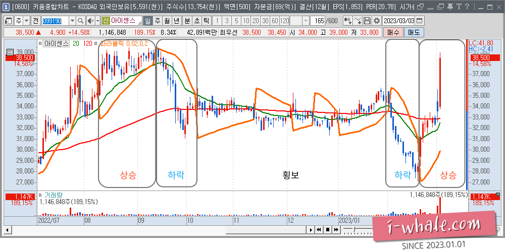주가의 등락 폭이 좁은 상황에서 파라볼릭 값을 터치하니 추세의 전환이 이루어지는 것이며 이는 휩소가 됩니다.